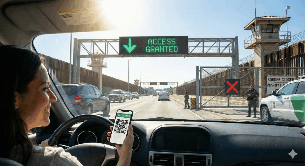 Secure Pre-Pass is a system for secure base access by vehicles on-the-move. Users request access via an app on their phone after taking a selfie, entering a PIN, and selecting a location. The phone adds its own unique identifier and sends an access request to a server, which verifies the user by facial recognition, PIN, and phone identifier (3-factor authentication). If the user is authorized access, the server returns a confirmation secret displayed on the phone as a QR code (in 3 seconds or less). At the gate, confirmed users are recognized via RFID code or a message sent by the user’s phone and directed into a “fast lane” by signal lights. All vehicles in the fast lane are confirmed, and violators are stopped by a red light and/or boom gate while guards are audibly alerted.