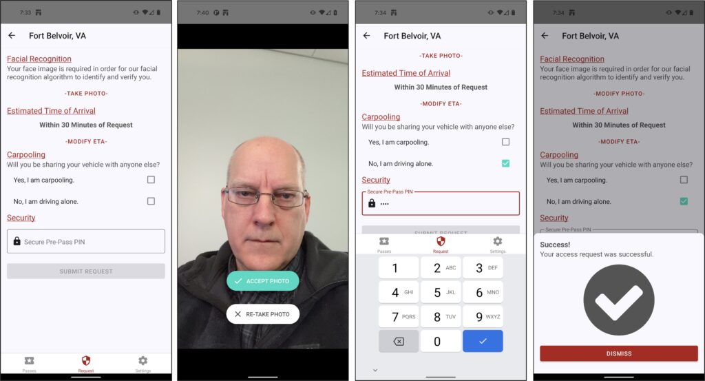 Confirmations are valid for a limited time window, which is established by base policy and may be adjusted to support current threat conditions. Users may set an estimated time of arrival, and they can also cancel or make new requests at any time. The QR code representing a confirmation is displayed on the phone and may be used directly, in place of RFID, for pedestrian access.